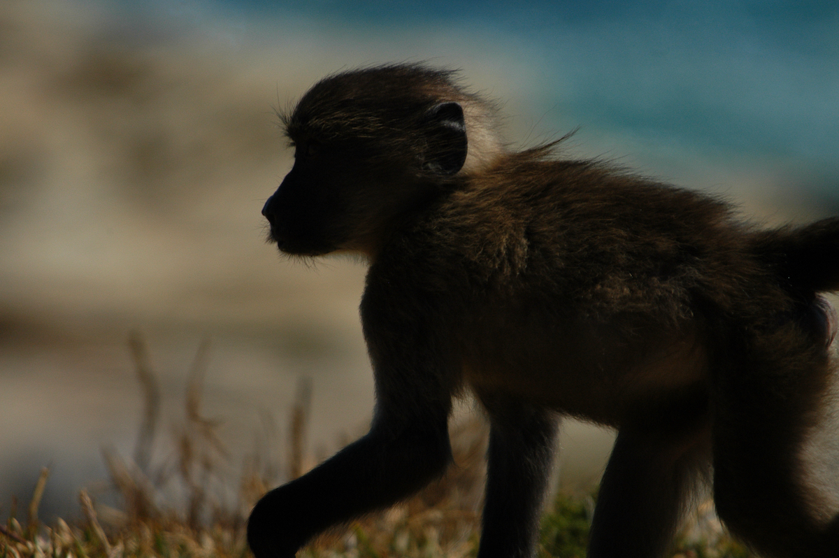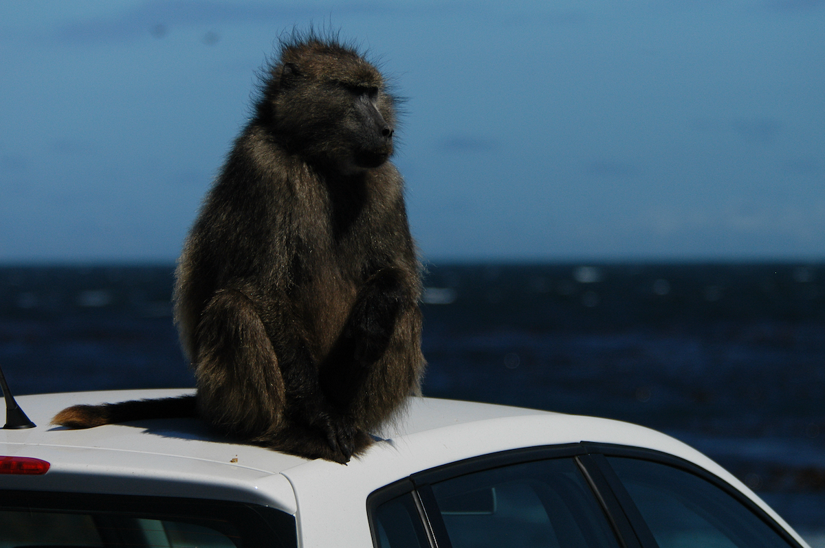 We headed for the Cape of Good Hope and Cape Point, driving on a windy mountain road right on the coast. Cameras were continuously snapping as we ooh-ed and ahh-ed at the sites in front of us. The water looked so tropical and inviting, but Matt assured us it was freezing and had intense undertow. We began to see signs reading, "Baboons are dangerous and attracted by food", and got very excited. After we entered the National Park, we had our first sighting, accompanied by squeals and many clicks of the camera. We were soon to become disenchanted.