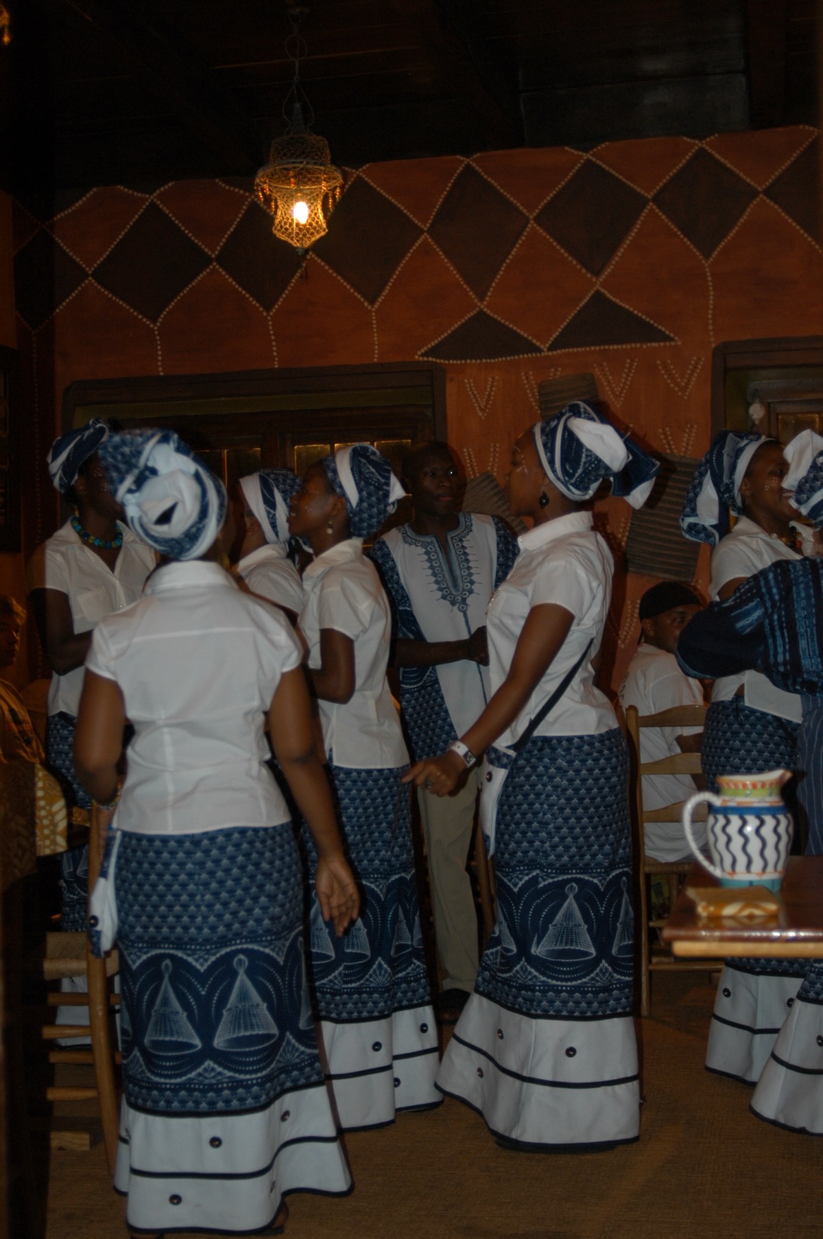 A while later it showed up and the next adventure was watching the drivers learn how to drive backward sticks since South Africa drives on the left side of the road instead of the right side like us. That was a good time. J When we arrived at Cornerstone we all took showers and got ready to go eat at The Africa Cafe in downtown Cape Town. This was a very interesting experience. There was no need to order because everyone ate the same thing?everything. The feast was made up of dishes from all over Africa and if you liked something you could order as much of it as you would like?however there were so many dishes to get through you were pretty much stuffed by the time the last dish. The food was great, but the entertainment was the best.