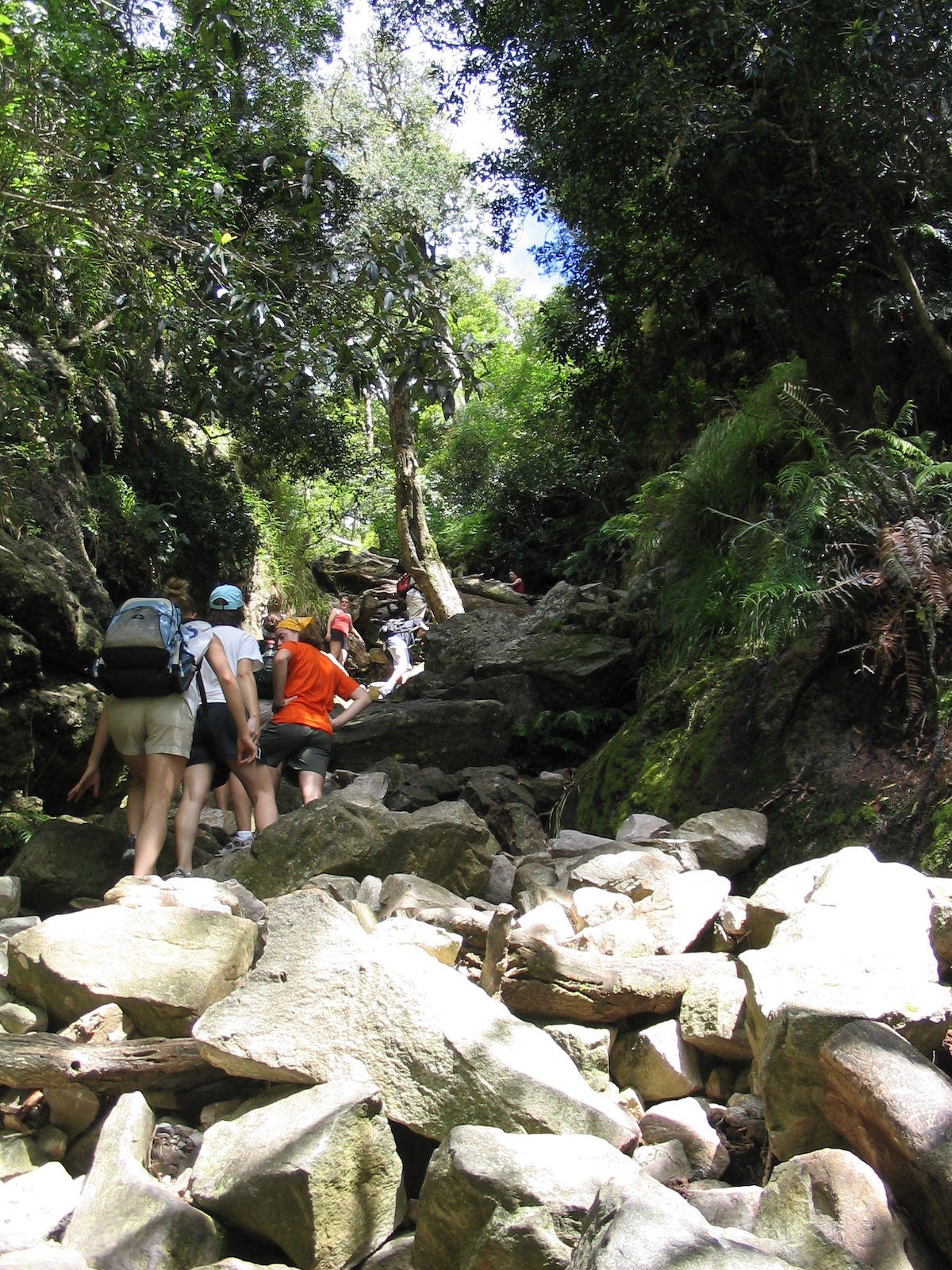It wasn't long before our company entered skeleton gorge. Harsh and unforgiving, the gorge endeavored to hinder our progress which each turn. By an arsenal of goliath boulders, vertical walls of stone, and inclines to challenge the nimblest of fauna, we were assaulted. But through shear determination driven by the promise of the untold beauty and wonder of the majestic vistas that awaited we persevered. And so we climbed. Laboring under a canopy of green, we climbed, overcoming boulders with grace, stone walls with ladders, and the steep table mountain inclines with shear will power; We climbed.