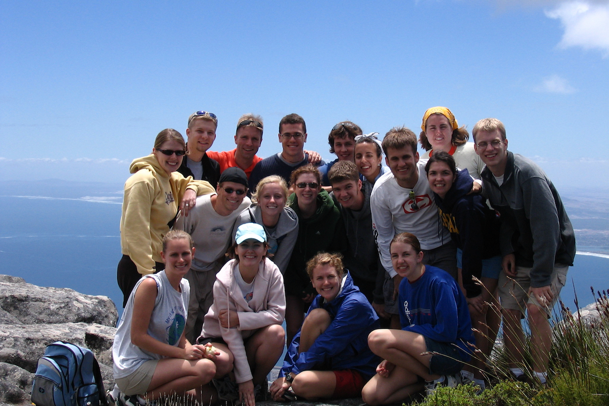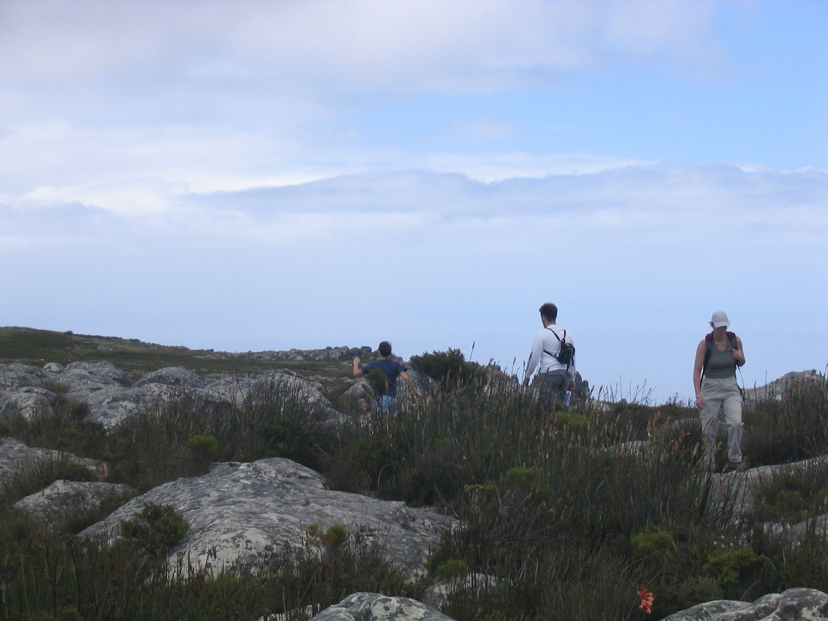 Crossing a stream we beheld the rear Red Disa, a brilliant orchid found in few places on earth. Not long afterwards, our company crested the final ridge and found ourselves on the top of Table Mountain. Kings and Queens we were, on the top of the world, crowned with the very clouds themselves. In joyful exuberance while feasting upon lunches of PB&J one of our company suggested we declare our victory with a ceremonial casting away of food off the edge of the cliffs around us. Equipped with only half an Oreo he would have done it, had it not been for the less than enthusiastic support of some. However, not completely without allies, a stick was cast from the mountain; We rejoiced and then journeyed on.