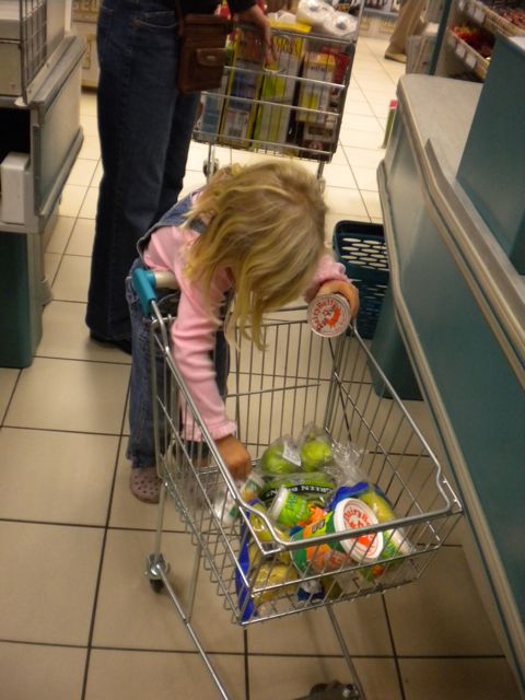 Catherine was quite happy to unload her cartful before her Mom behind her.