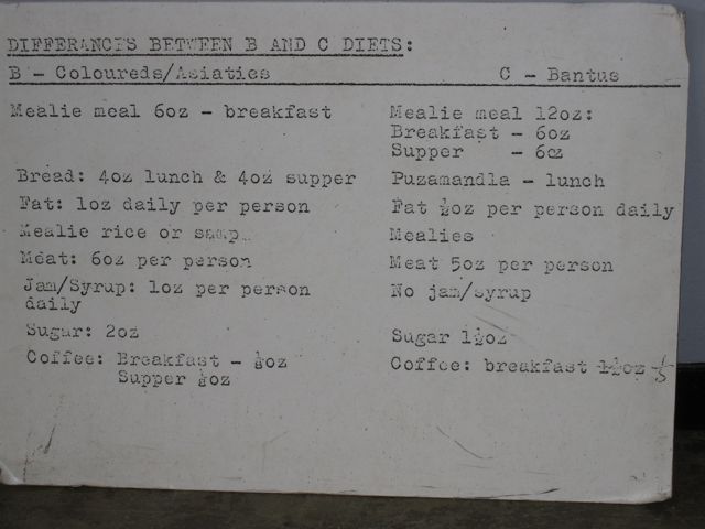 From reading this, you can see that even diets were divided among racial lines. Bantus means Uneducated (Black). As Dumisani said, once you were in prison, they dropped their group affiliation, and banded together. In fact, after a 5-day hunger strike by all of them, the prison agreed to change this menu so that it was the same for all.