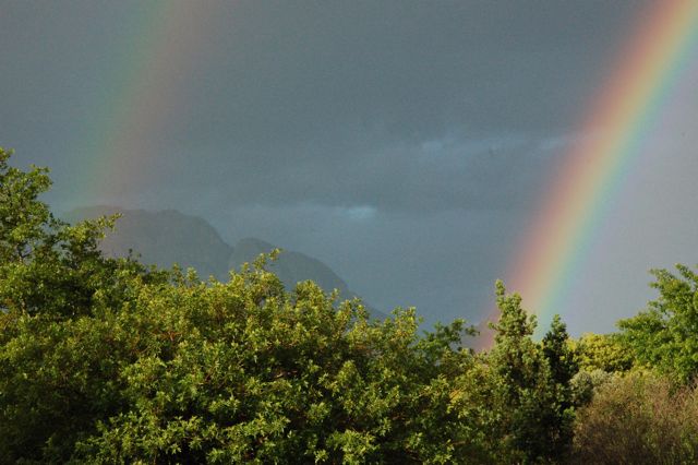 An evening thunderstorm (very rare) brought rain and dark clouds in the midst of sunshine. The result was a double rainbow right after dinner.