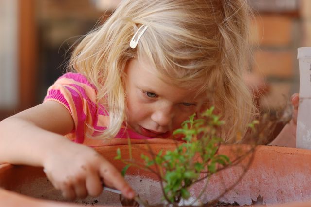Then she worked very hard to bury the roots, carefully patting the soil around the stem with her spoon.