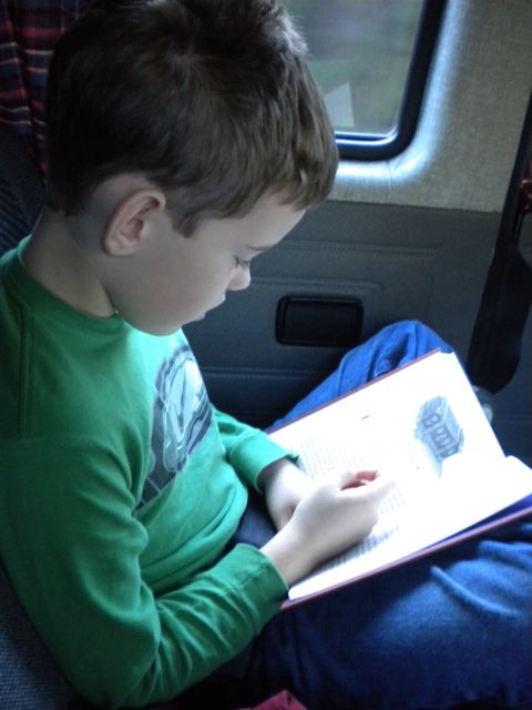 Mark was content to read Harry Potter in the Kombi backseat.