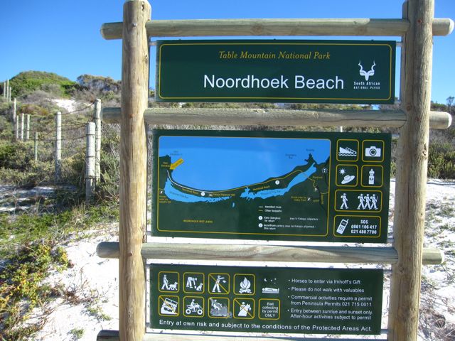 Noordhoek is on the Atlantic side of the Cape Peninsula. As such, its stunningly green water is always very cold. Noordhoek has some of the whitest sand I've ever seen: it is visible from Chapman's Peak Drive, which is presently closed for repairs.
