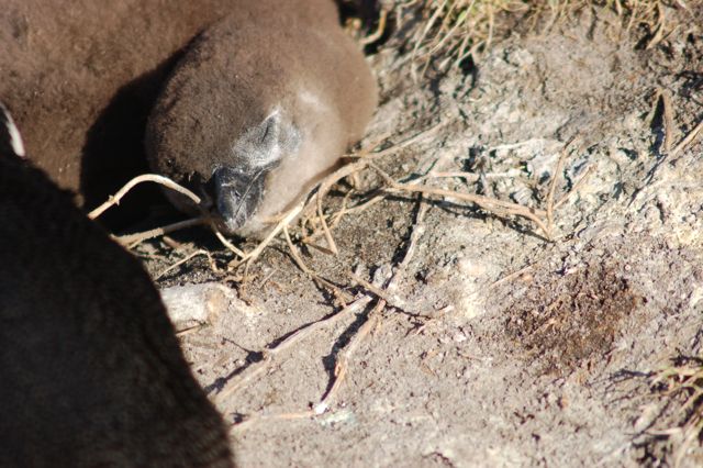 There are several chicks in the colony. This one was sleeping right near the boardwalk.