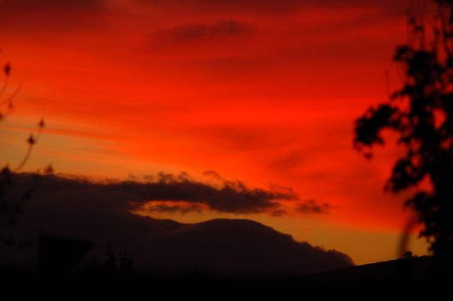 As the sun went below the horizon, the upper-level clouds lit up bright red. This photo is true color. It was amazing. Notice that the underside of the top part of the tablecloth clouds are lit red, too.