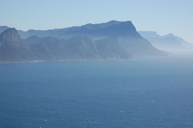 The coastline of False Bay was a bit hazy, but still beautiful. This photo looks northward from Cape Point. Muizenberg, Table Mountain, and Devil's Peak are visible on the right.