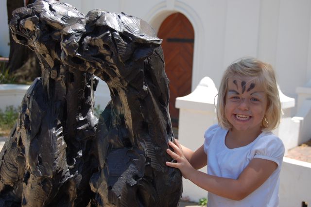 Catherine's face painting is left over from yesterday when we went to the mall in Somerset West where there was a kids area in which arts and crafts were provided. She was a tiger. So the cheetahs and a tiger are playing together on Plein Street in Stellenbosch.