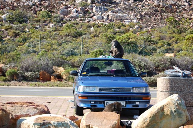 These two baboons decided to raid the bin (right) and eat the contents while sitting on OUR CAR! Fortunately, we had closed the windows. They didn't steal anything from us, but we had to wait for them to finish before we could continue down the coast.
