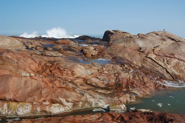 The Cape Columbine Nature Reserve provided lots of places to scramble on the coastline. This photo shows the weathered rocks that separate the land from the sea. I love the colors and textures here: weathered red rocks, smooth green sea, frothy white spray, clear blue sky. Lekker photo!