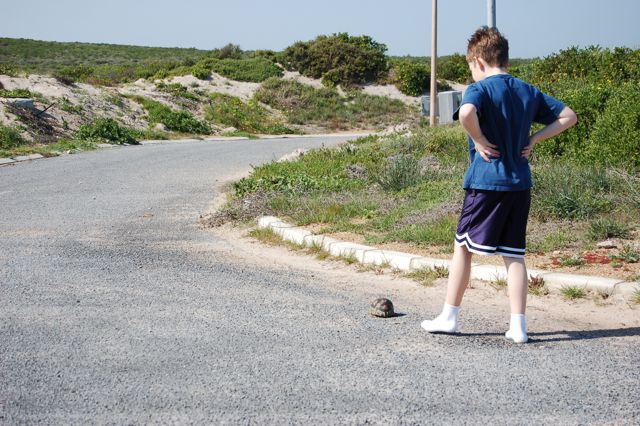 As we were driving out of the Cape Columbine Nature Reserve, we saw this tortoise crossing the road. Mark took great interest and hopped out to check on it.