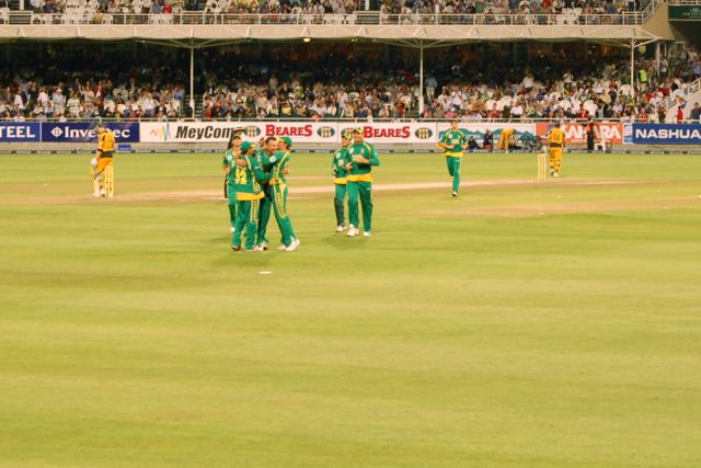South Africa celebrates taking Ricky Ponting's wicket. He's exiting from the right side of the pitch.