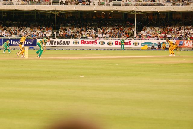 Parnell is a left-handed fast bowler. Here he is delivering to Australia early in their innings.