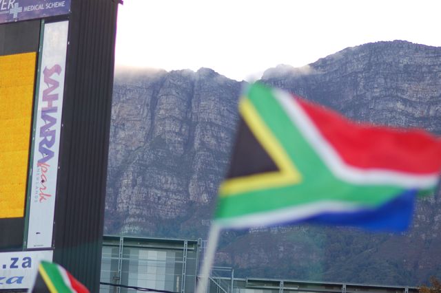 Wispy clouds spill over the top of Table Mountain as a fan waves the flag.