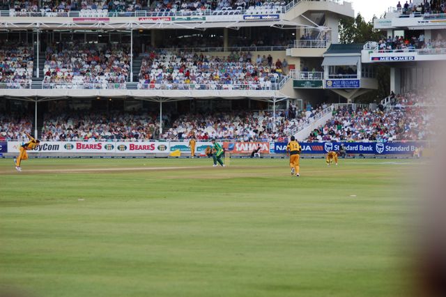 The photo shows the size of the pitch relative to the stadium. If you know what to look for, you'll see (from left to right) the Australian bowler, the ball just about ready to bounce on the pitch, the South African batsman, the wicket, and the Australian wicket-keeper.