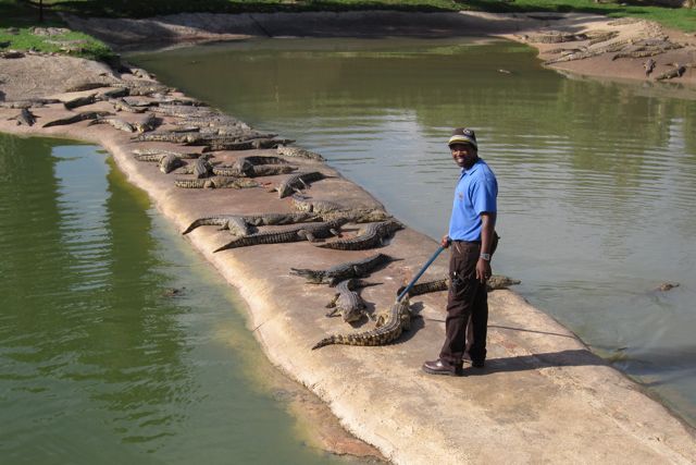 Our guide walked among the 2-3 year old crocs. Amazingly, they got out of his way when he approached. He said they used to take visitors among the crocs. They don't any more.