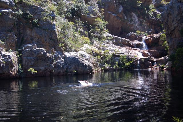 I'm doing what is required to reach the waterfall at the other end of the third pool: swim.