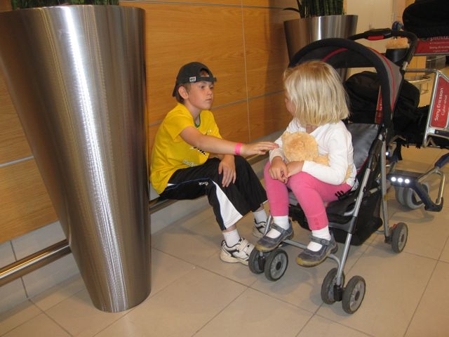 Airline travel includes a lot of hurry-up-and-wait, which is not so easy for kids. Mark and Catherine were waiting to go through security.