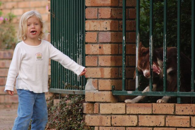 Tosca has a funny habit of chewing the bars of our fence when there is something interesting happening in the park. We kept her in our yard while the boys were playing cricket. Otherwise, she would have chased their ball and disrupted the game. Catherine's pointing out Tosca's habit in this photo.