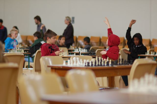 Hands are raised when the players think that checkmate has occurred. A monitor comes to the table to ensure that the match is, indeed, over.