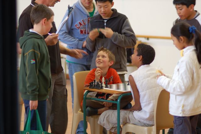 Mark played three long matches today. The first was against a very deliberate Grade 1 student. His final match against the Grade 7 opponent was also quite long. The match shown below was his fourth match of the day. This match ended as a draw. Long matches usually draw spectators who have completed their own matches.