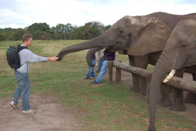 The elephants' reward for their time in the forest was sweet potatoes. In this photo, I'm depositing the vegetables in their trunk.