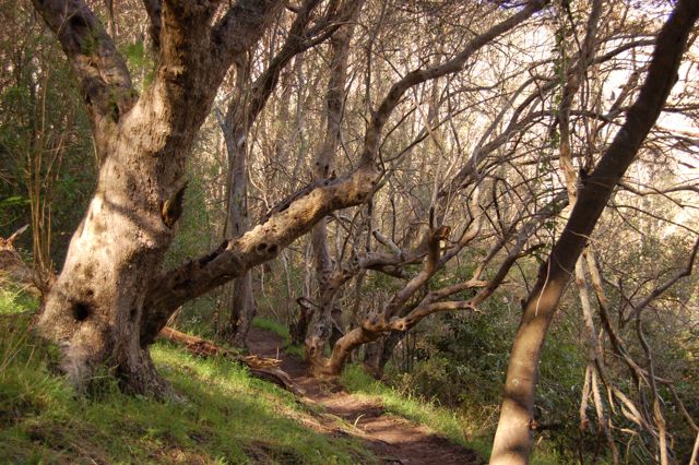 The trail followed a ridge through the woods. Mark thought these trees looked spooky.