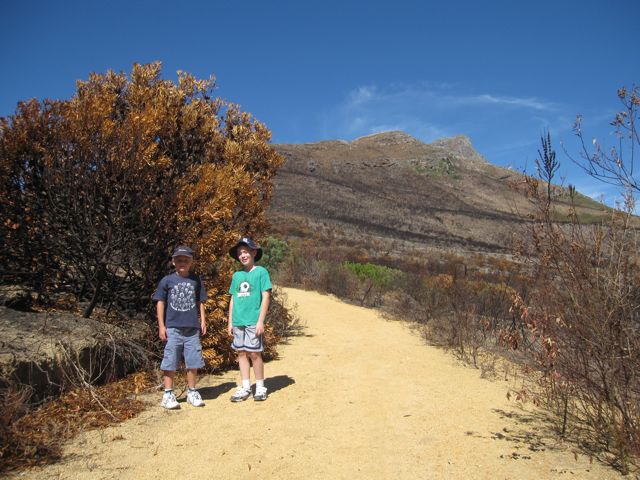 Some of the fire damage can be seen in this photo. The protea bush behind the boys is charred. And the mountain behind is black instead of green.