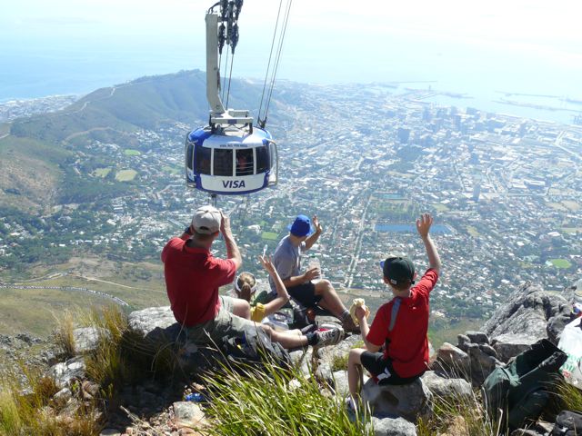 We greeted the cableway passengers as they passed us while we ate lunch.