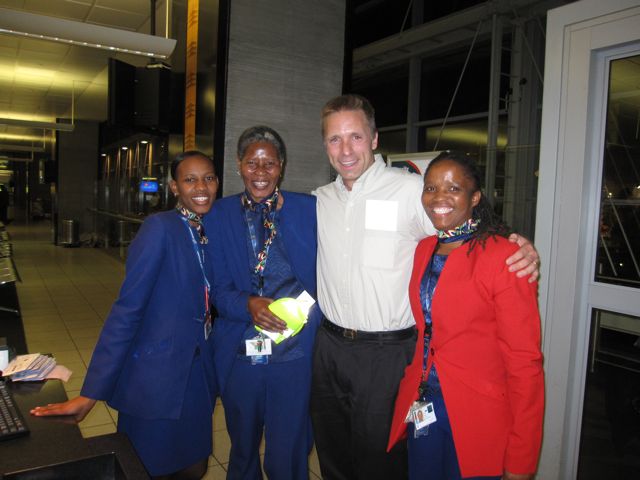 These are the gate agents that helped with the joke. I first approached the woman on the left in this photo. As I told her my plan, she just started smiling and shaking her head. "Oh, oh oh, that is really too much." She motioned to the others, "Come here and listen to this one." After they verified Hen and Jim's names on the manifest, they agreed to play along.