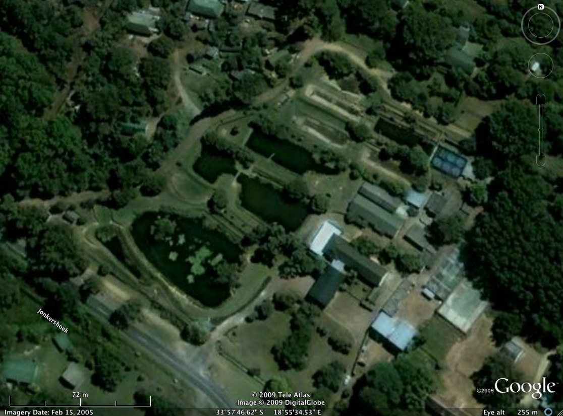 This is the fly fishing site. The south-west ponds near the road are at the lowest level. Northeast ponds are higher. A series of man-made canals conveys the water from one to the next. Ultimately, all this water flows down to the canals of Stellenbosch.