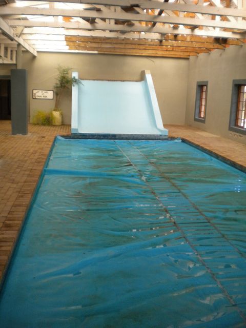 I found the slide at this pool a bit strange. It was painted concrete; large enough for 7 children to sit side by side and enter into the pool all at once. As is typical, there was only one sign, and you see it at the left--something like "Swim at your own risk"--nothing about how many people can go down the slide at one time.