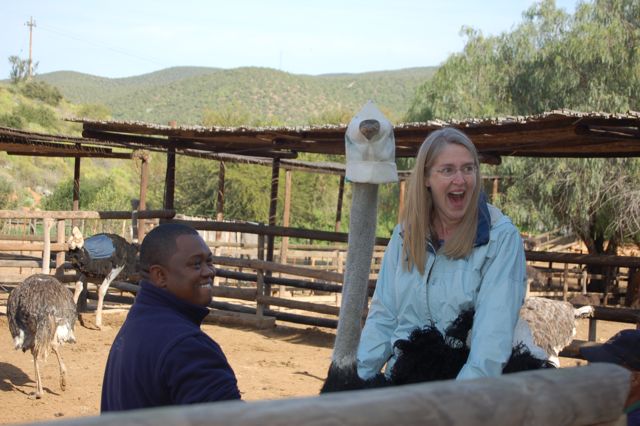 After watching 5 people safely try this, Tracy volunteered me and then nudged me forward. I got on the back, and was told to hang on to the feathers, and to use the neck as a direction "joystick".I love this picture of the ostrich looking straight at Matt.