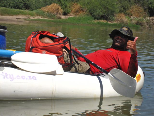 We had a long day of paddling during which we saw lots of wildlife, including a klipspringer, likkewaan (monitor lizard), goats, baboons, and a Marshall eagle. Duncan did his best to bond with the baboons by imitating their calls. On a lazy section of the river, Riki and I made a tour of each boat to take photos. This one shows Tubes relaxing (as usual) in the back of his croc.