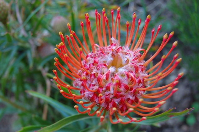 The first pincushion proteas in our garden are nearly fully open. You can see several unopened buds in the background, so we'll have many more proteas in the weeks ahead.