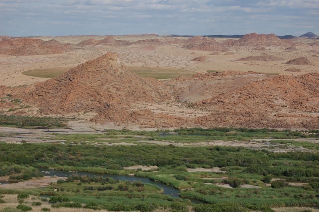 This photo clearly shows the "exotic" nature of the Orange River. You can also see an irrigated circular farm behind the small peak on the left of the image.
