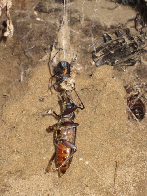 As we were loading the boats, we saw this deadly spider beginning its cockroach dining process. The carcasses of previous victims were littered about its nest.