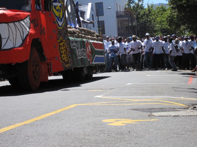This float poked fun at the (now) old days of Apartheid by re-creating the spirit of some of the anti-Apartheid protests. The truck had a bunch of white "soldiers" firing a fake tear gas cannon. Behind the truck were a bunch of youths who were toyi-toying as they pursued the soldiers. I had mixed feelings about this. Such protests were among the many causes for the fall of Apartheid. But, they were no laughing matter. Many protesters and fewer police officers lost their lives during the real marches. I suppose it is good that young South Africans are far-enough removed from the challenges and tragedies of the Apartheid; those days are now the stuff of parades.