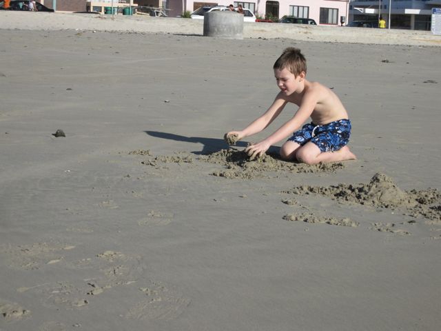 I am making sand castles. It was very windy. The sand kept whipping my face!