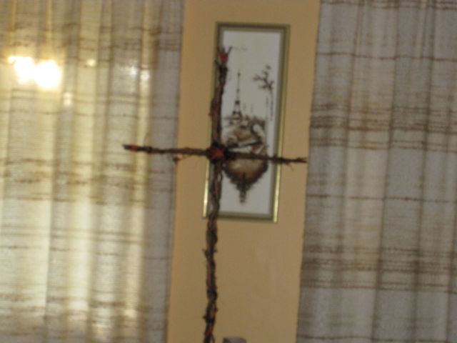 This is a wooden cross in our house. It is in the living room. It is three feet tall, and it is a foot and a half wide.