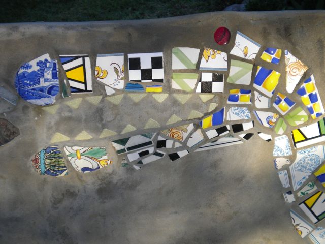 At Moonshine, the owners had a braai areaa where there were beautful sitting areaas. This stone bench had a mosaic dragon on the back side of it.