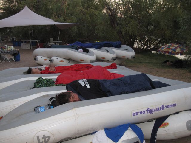Stefan was the first to try a boat bed, constructed by laying a boat upside down across two boats beneath. I didn't bother with this: it seemed like a lot of work, and I was sleeping fine on the ground.