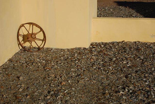 This old rim sits in an interesting corner outside our cottage.