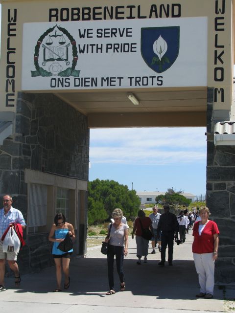 Hen is under the welcome sign to Robben Island.