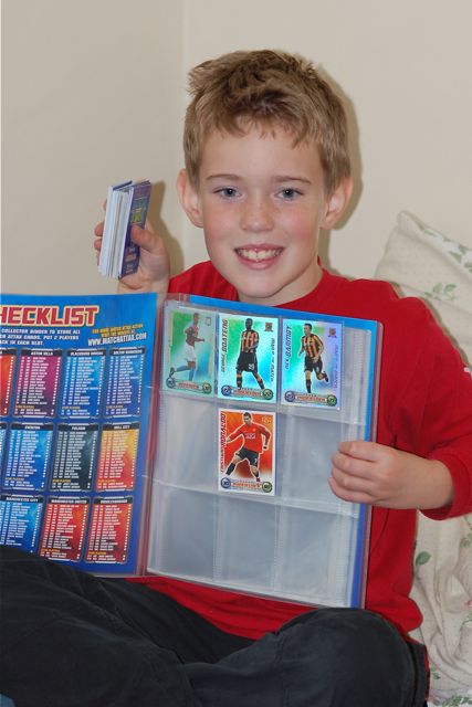 This is Mark's Match Attax binder. Match Attax are English Premier League football cards. The players each have attack and defense points, and collectors can play against each other using their cards' point values. Mark and his friends at school mostly just collect and trade them.