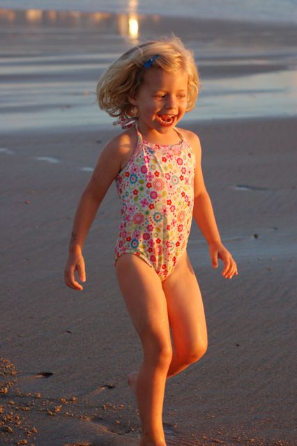 Catherine loved the texture of the sand on her feet. She was jumping and running in the region where the sand meets the sea and everything is very soft. You can see the beachfront buildings reflected in the water behind her.