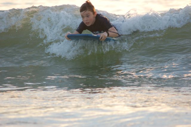 Mark spent the evening on his boogie board, working on catching the waves at just the right time. I did a lot of body surfing. We had a great time!