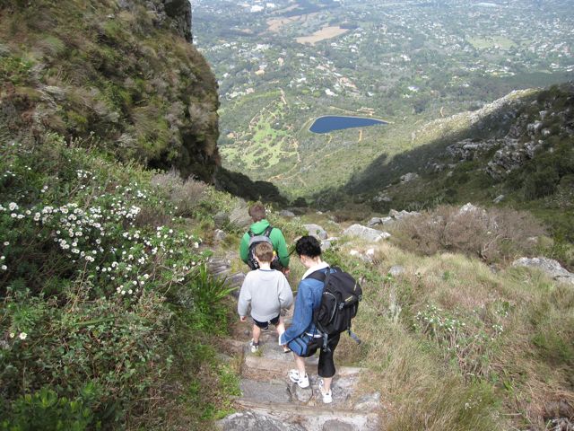 This was the path down the ravine. The green patches below (to the left of the dam) are our destination, Kirstenbosch Garden.
